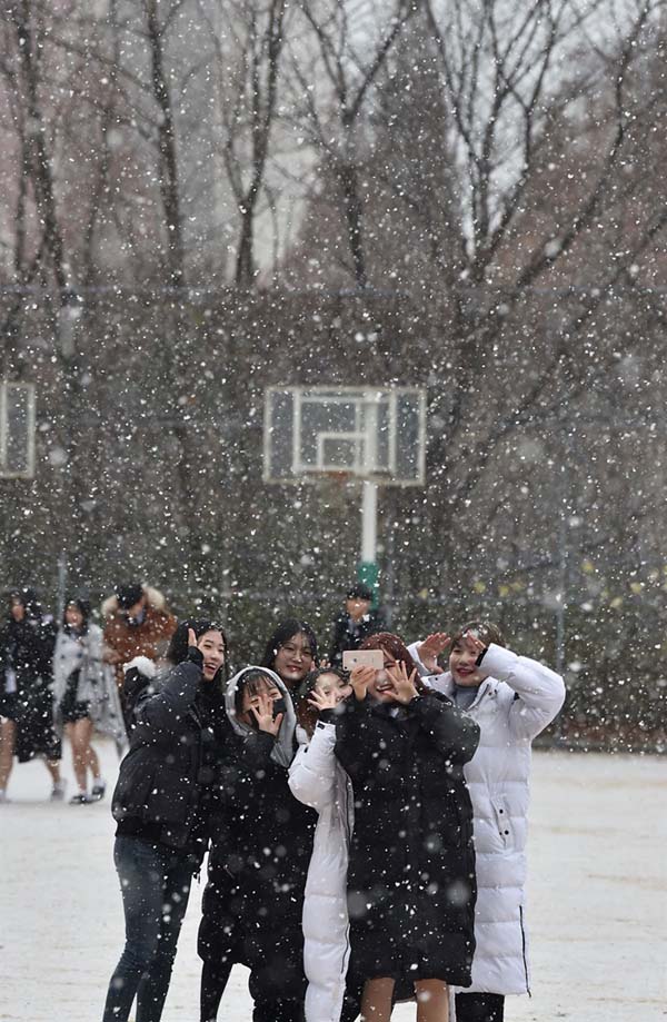 (함박눈이 내린 12월3일 오전 경기 군포시 산본고등학교 운동장에서 학생들이 눈을 맞으며 셀카 촬영을 하고 있다. 뉴시스)