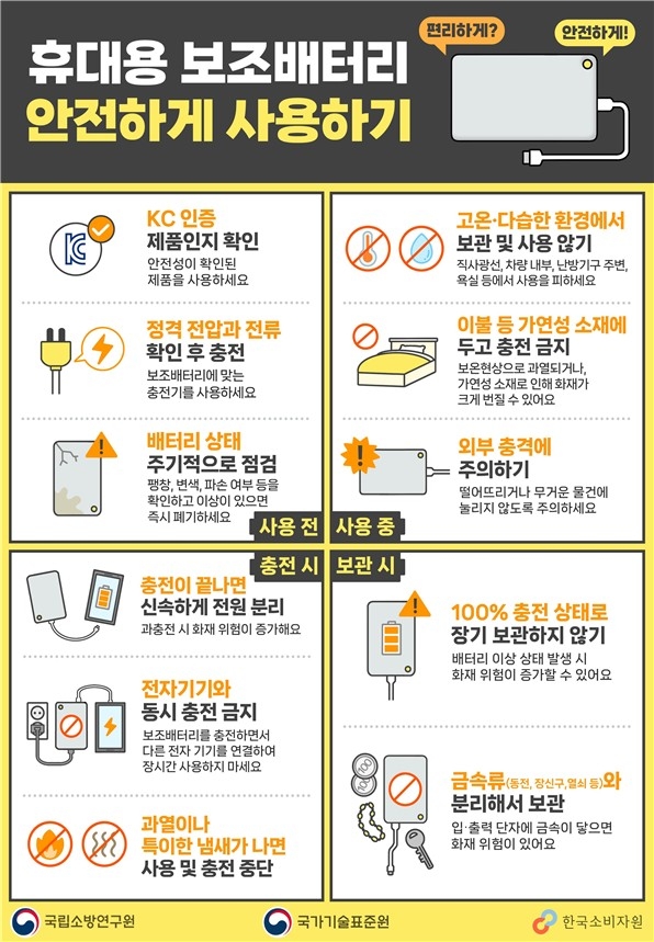 한국소비자원은 산업통상자원부 국가기술표준원, 국립소방연구원과 함께 휴대용 보조배터리를 안전하게 사용할 수 있도록 홍보 캠페인을 전개한다고 17일 밝혔다.