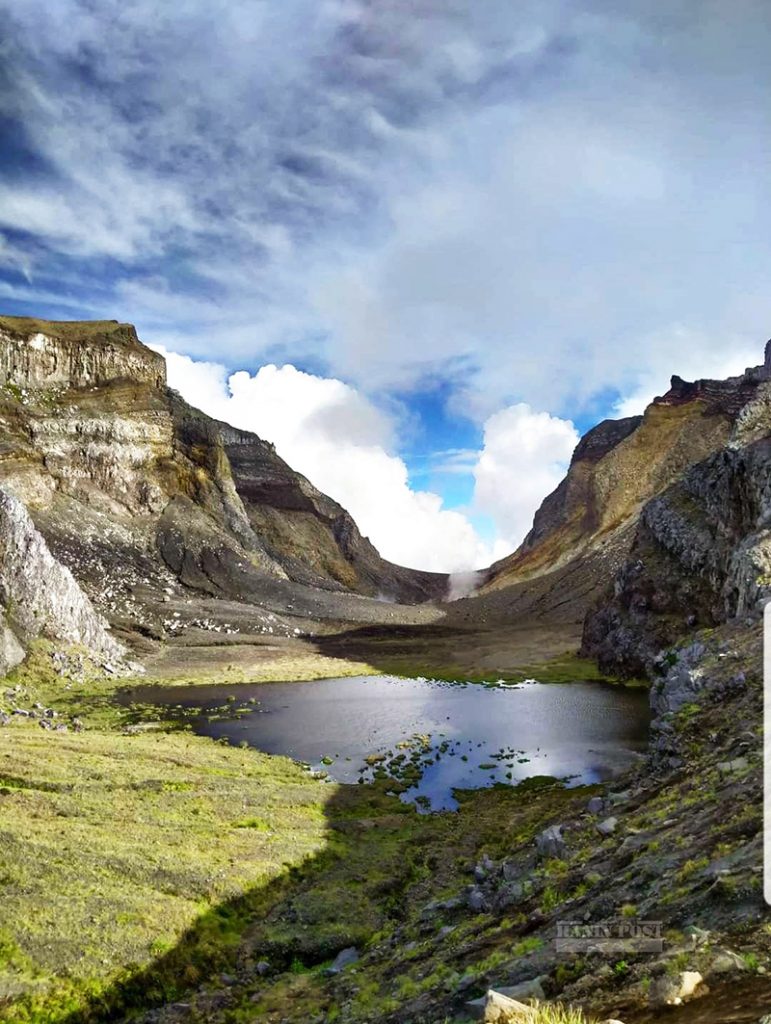 감코노라 산의 분화구는 동쪽과 서쪽이 높은 벽으로 둘러싸인 U자형 계곡에 위치해 있다.