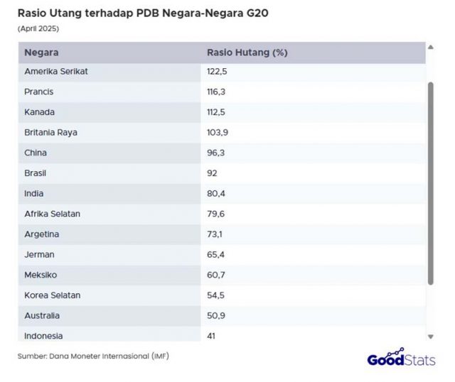 최근 통계 분석 플랫폼 굿스탯츠(Goodstats)가 인용한 IMF의 2025년 4월 전망에 따르면, 인도네시아의 GDP 대비 국가 부채 비율은 41%로 집계됐다.