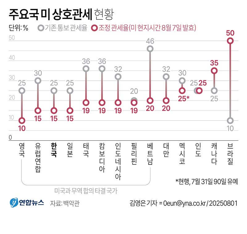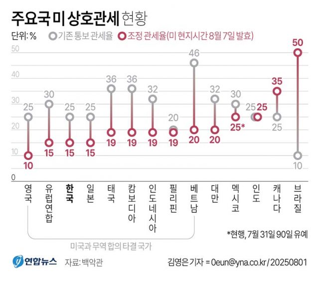 또 트럼프 정부는 ’90일 관세 부과 유예 시한’을 하루 앞둔 지난달 7일엔 한국을 비롯한 주요 10여개 무역상대국에 상호관세율을 다시 통보하고 8월 1일로 발효 시점을 못 박으며 막판 1대1 협상에 박차를 가했다.