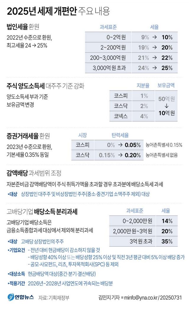 기획재정부가 31일 확정안 '2025년 세제개편안'에 따르면 법인세 세율이 모든 과세표준(과표) 구간에 걸쳐 1%포인트씩 일괄 인상된다.