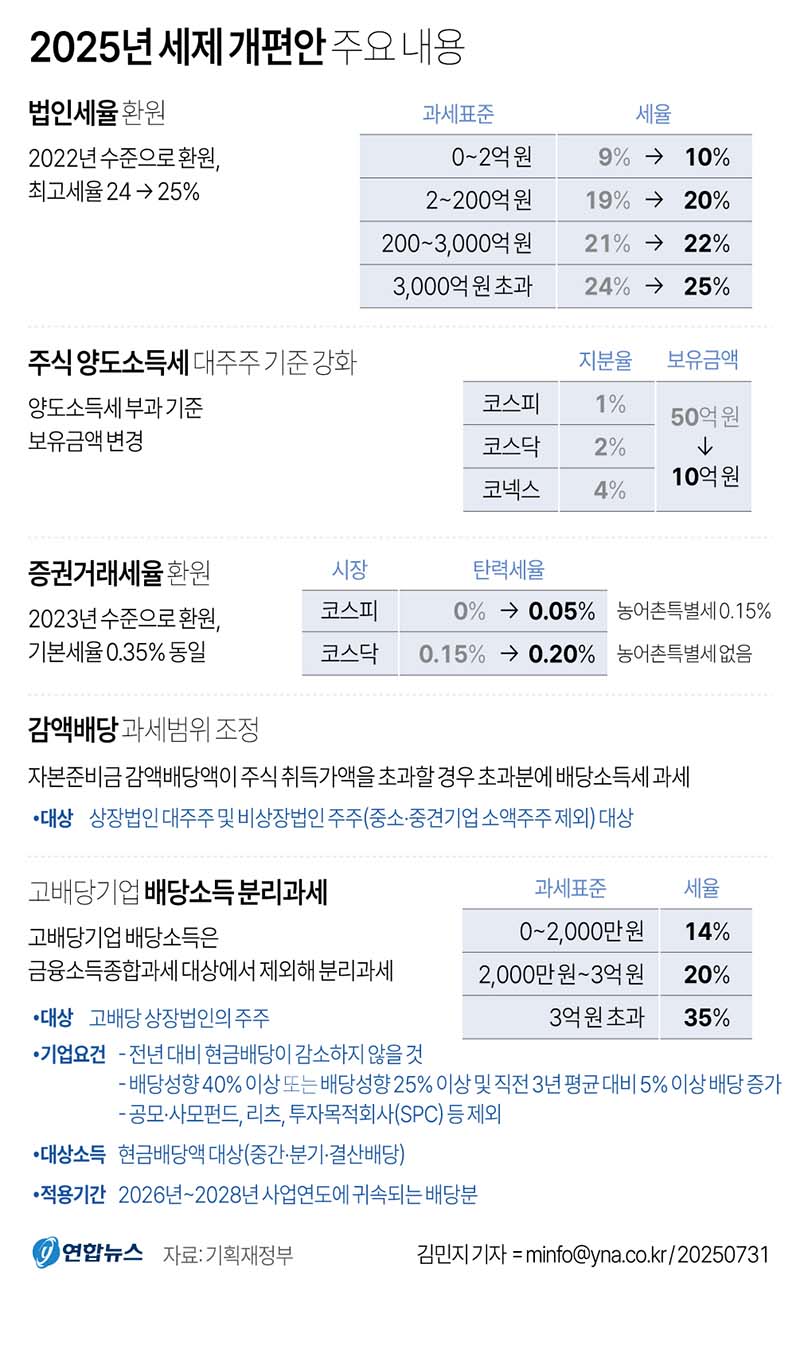 주식 양도소득세가 부과되는 대주주 기준도 50억원에서 10억원으로 환원된다.