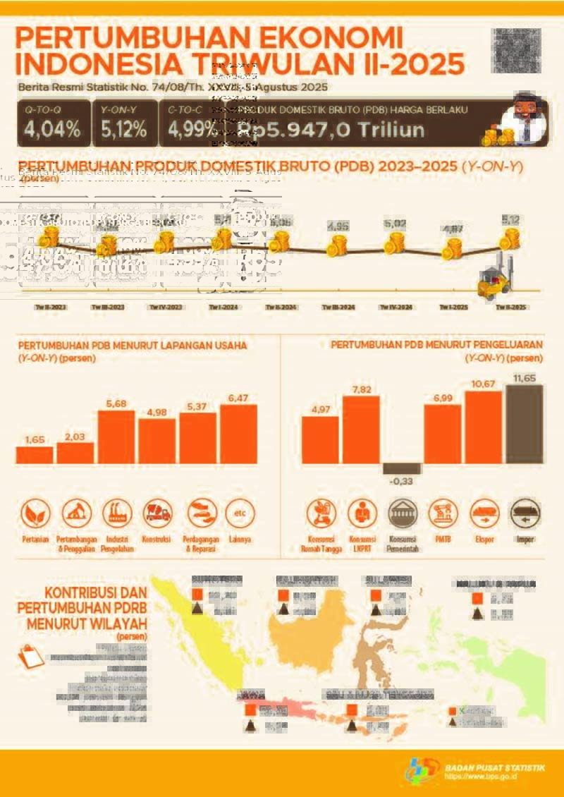 중앙통계청(BPS)이 발표한 공식 자료에 따르면, 2025년 2분기 인도네시아 경제 성장률은 전년 동기 대비 5.12%를 기록했다.