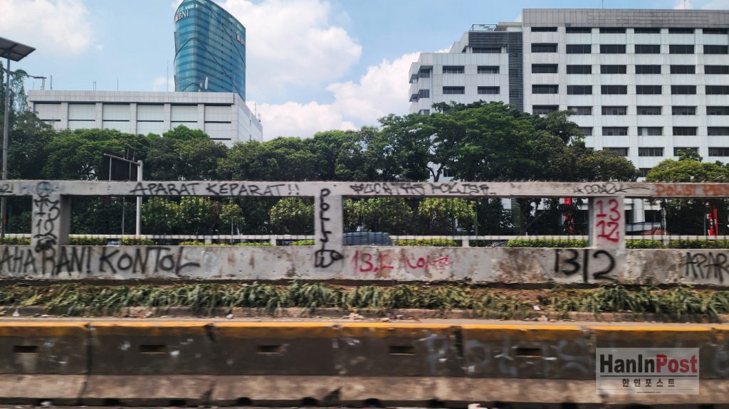 인도네시아 국회의사당 정문앞에 있는 유로도로 담에 지난 8월 29일 시위대가 페인트로 훼손했다. 2025.9.1.사진 한인포스트