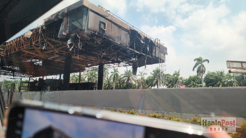 인도네시아 국회의사당 정문앞에 있는 유로도로 톨게이트가 지난 8월 29일 시위대 방화로 전소돼 있다. 2025.9.1.사진 한인포스트