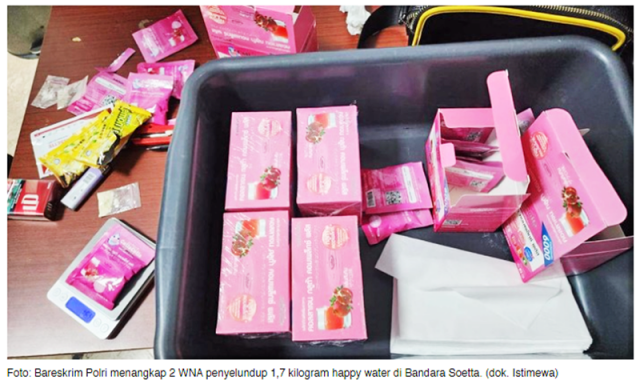 인도네시아 경찰이 항공편을 통해 대량의 신종 마약을 밀반입하려던 국제 마약 조직원 2명을 체포하고, ‘해피 워터(Happy Water)’로 불리는 마약 1.7kg을 압수했다.