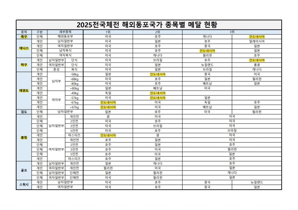 한편, 재인도네시아 대한체육회는 오는 2025년 12월 17일 자카르타의 한 호텔에서 ‘제106회 전국체전 성과보고회 및 감사의 밤’을 열 예정이다. 이날 자리에서는 선수단의 활약상을 공유하고, 대회 기간 중 아낌없는 성원을 보내준 동포와 후원단체에 감사의 마음을 전할 계획이다.