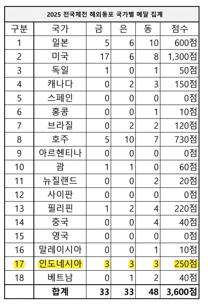 (부산=한인포스트) 2025년 10월 부산에서 열린 제106회 전국체육대회에서 재인도네시아 대한체육회 선수단이 종합 4위를 차지하며 해외 동포 체육인의 저력을 유감없이 발휘했다. 이번 대회에서 선수단은 금메달 3개, 은메달 3개, 동메달 3개 등 모두 9개의 메달을 획득하며, 지난해 3위 성적에 버금가는 성과를 거두었다.