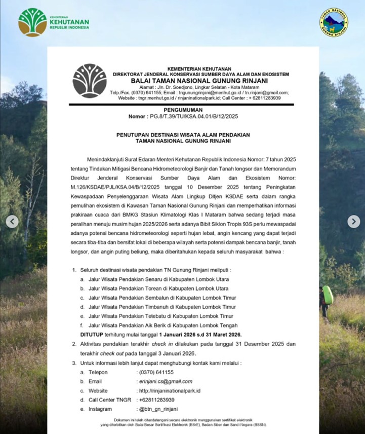 린자니산 국립공원관리공단(Balai Taman Nasional Gunung Rinjani)은 2026년 1월 1일부터 3월 31일까지 3개월간 린자니산의 모든 등반로를 폐쇄한다고 공식 발표했다.