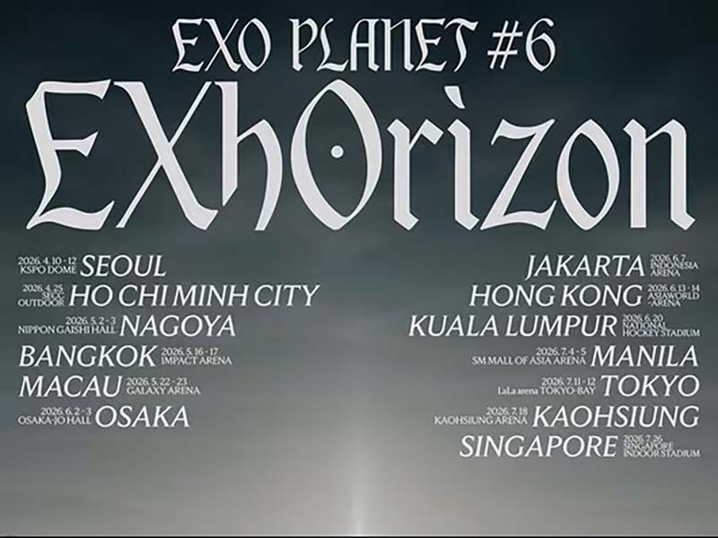 엑소의 소속사는 공식 소셜 미디어 채널을 통해 월드 투어 콘서트 ‘EXO PLANET #6 – EXhOrizon(엑소 플래닛 #6 – 엑소리즌)’의 개최 소식을 알리고, 구체적인 투어 일정을 공개했다. 공개된 일정에 따르면 엑소는 2026년 6월 7일(일), 인도네시아 자카르타에 위치한 ‘인도네시아 아레나(Indonesia Arena)’에서 화려한 무대를 펼칠 예정이다.