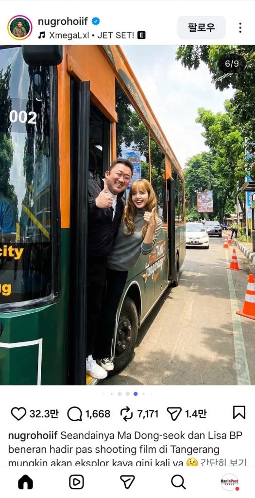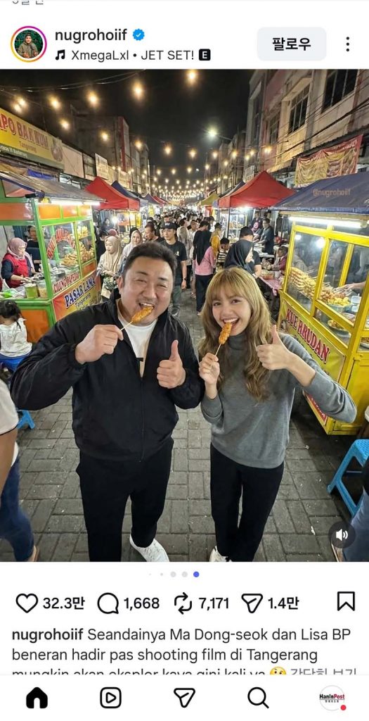 [자카르타=한인포스트] 배우 마동석과 그룹 블랙핑크(BLACKPINK)의 멤버 리사가 출연하는 글로벌 대작 영화의 촬영으로 인도네시아 수도 자카르타와 인근 도시 땅그랑이 들썩이고 있다.