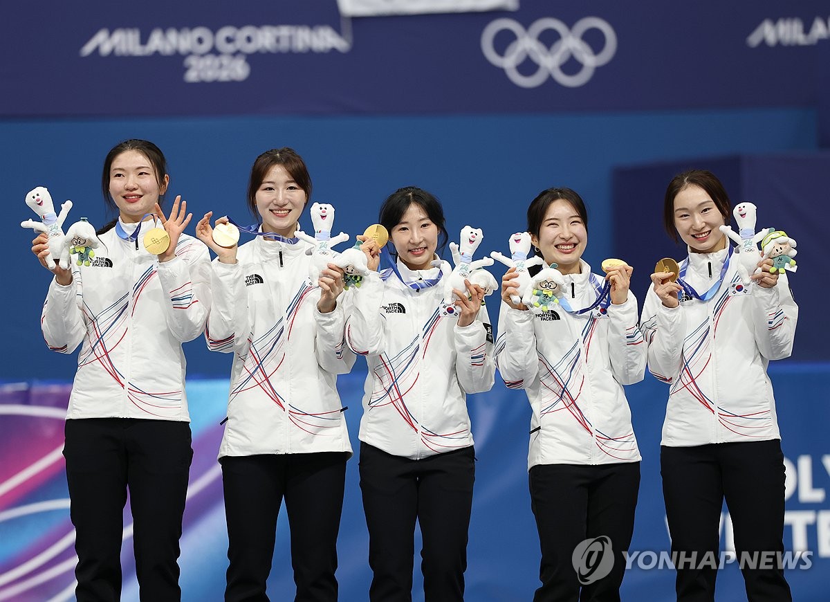(밀라노=연합뉴스) 18일(현지시간) 이탈리아 밀라노 아이스스케이팅 아레나에서 열린 2026 밀라노-코르티나담페초 동계올림픽 쇼트트랙 여자 3000m 계주 결승에서 금메달을 따낸 한국 선수들이 메달을 목에 걸고 메달리스트들과 함께 포즈를 취하고 있다. 오른쪽부터 최민정, 김길리, 이소연, 노도희, 심석희. 2026.2.19