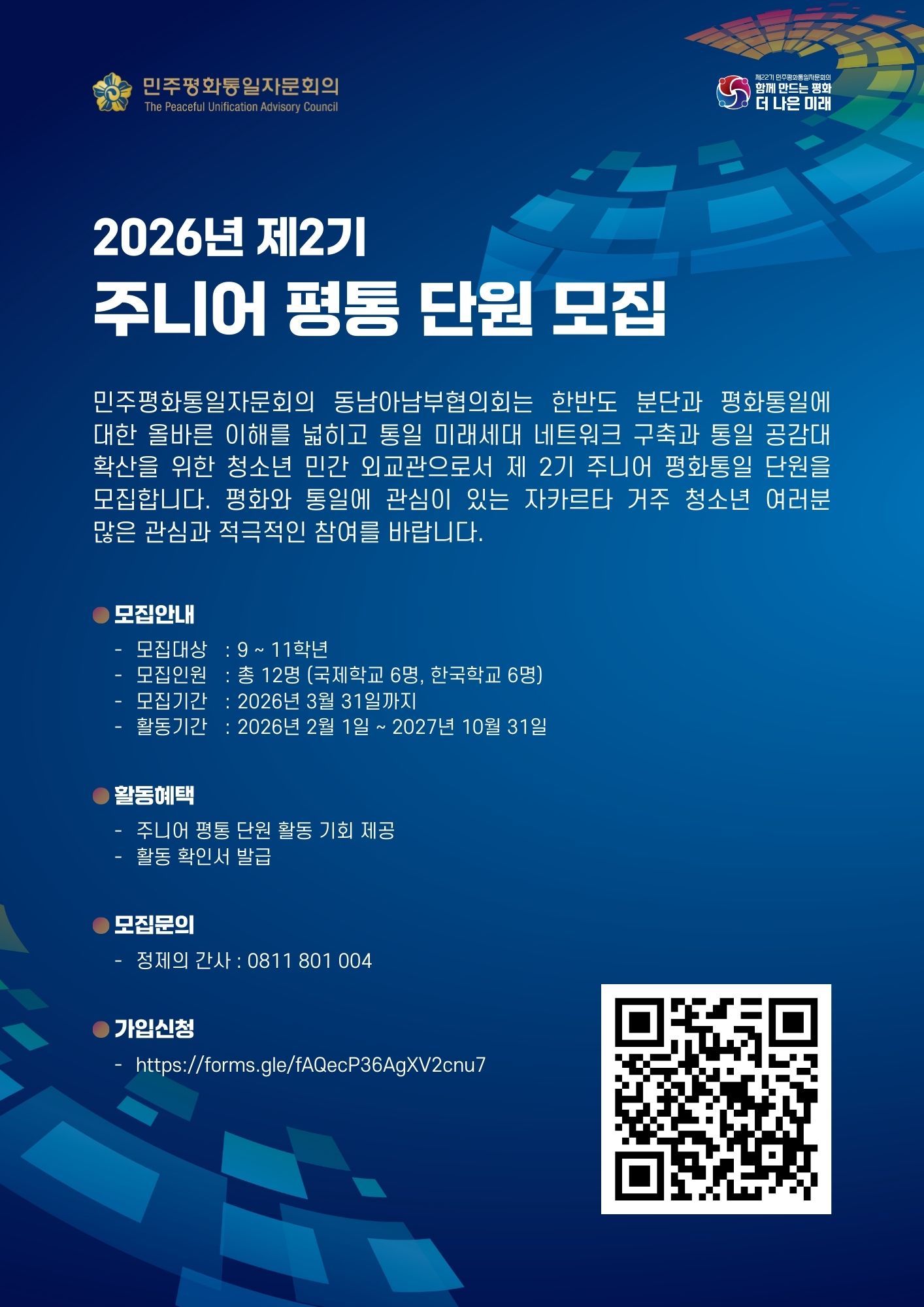 동남아남부협의회 주니어 평통(2기, 2026-27년)을 모집합니다.