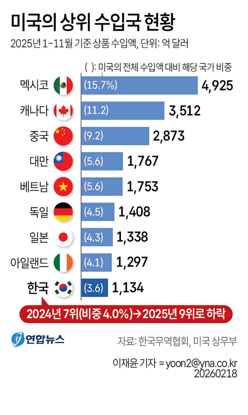 18일 한국무역협회가 미국 상무부 수출입 통계를 분석한 자료에 따르면 지난해(1∼11월 기준) 미국은 한국으로부터 1천134억달러어치 상품을 수입했다. 한국은 지난해 미국 전체 수입의 3.6%를 차지하며 미국의 10대 수입국 중 9위에 위치했다. 이는 전년과 비교하면 2계단 뒤로 밀려난 것이다.
