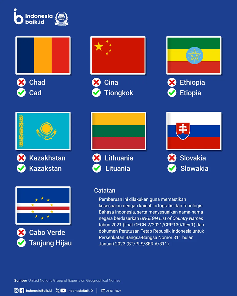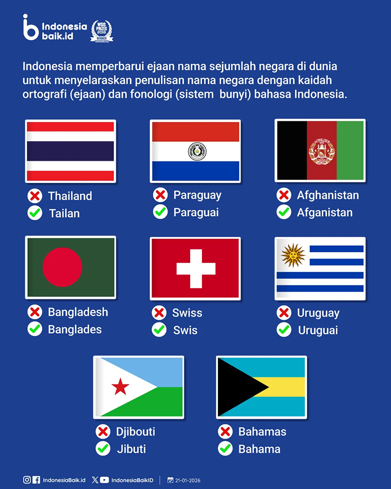 확정된 변경 사례로는 Thailand를 ‘Tailan’, Paraguay를 ‘Paraguai’, Afghanistan을 ‘Afganistan’으로 적는 방식이 포함된다. 또한 Swiss는 ‘Swis’, Uruguay는 ‘Uruguai’, Djibouti는 ‘Jibuti’로 표기되며, 중국의 명칭은 ‘Tiongkok’ 형태를 공식적으로 사용한다.