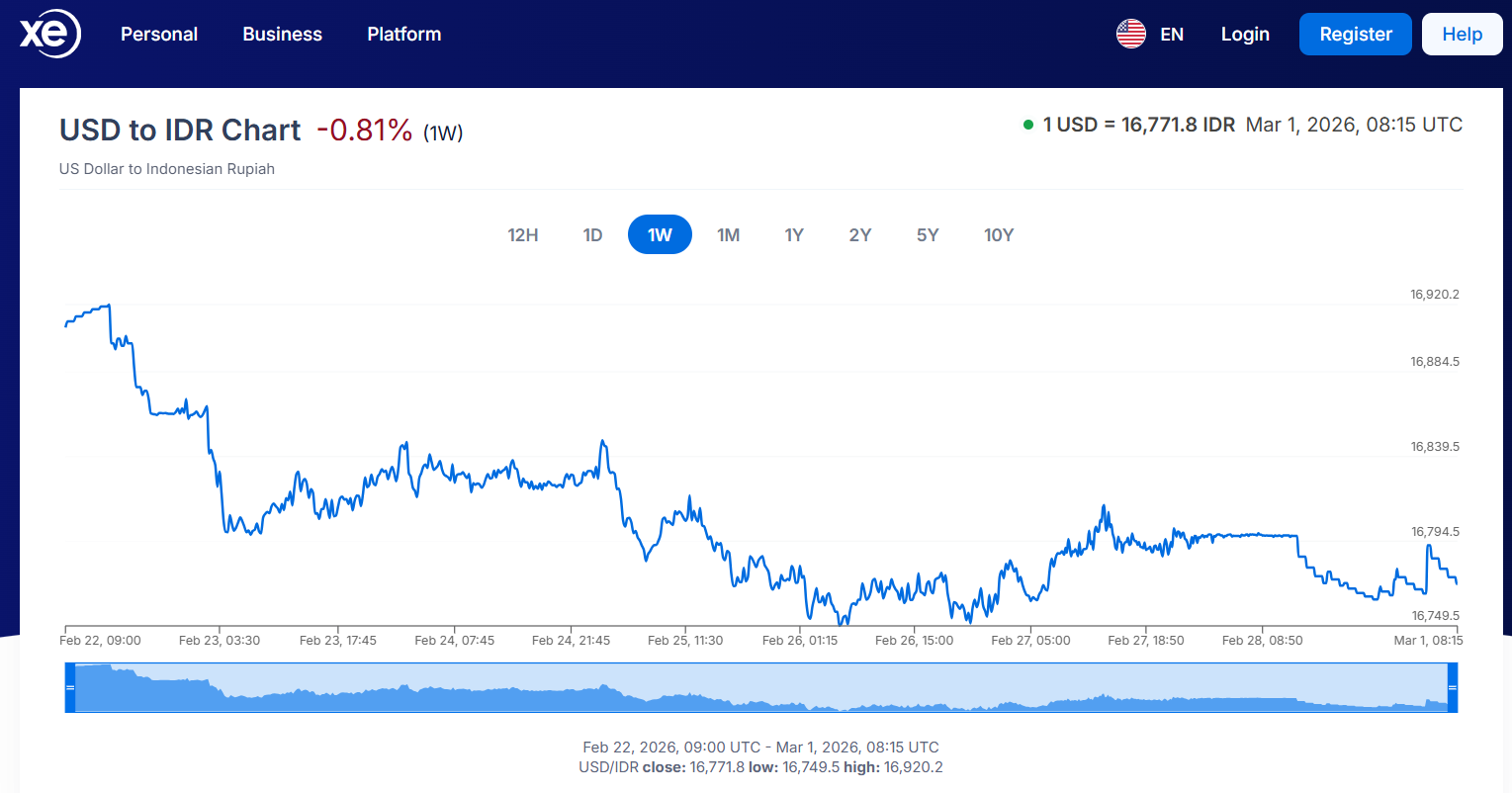 주말을 앞둔 2월 27일(금요일), 미국 달러 대비 인도네시아 루피아 환율이 대내외 경제 심리 위축과 글로벌 시장 압박의 여파로 약세 마감했다. 이날 루피아 환율은 전 거래일 종가(16,759루피아) 대비 0.17%(28포인트) 하락한 달러당 16,787루피아를 기록했다.
