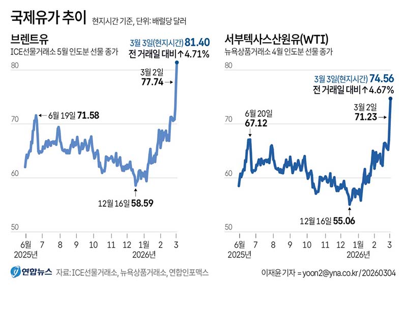 미국과 이란의 무력충돌 속에 이란이 호르무즈 해협을 사실상 봉쇄하면서 국제 유가가 3일(현지시간) 상승세를 이어갔다. 이날 ICE선물거래소에서 브렌트유 선물 종가는 배럴당 81.4달러로 전장보다 3.66달러(4.71%) 올랐다. 뉴욕상품거래소에서 서부 텍사스산 원유(WTI)는 3.33달러(4.67%) 상승한 배럴당 74.56달러에 거래를 마쳤다.