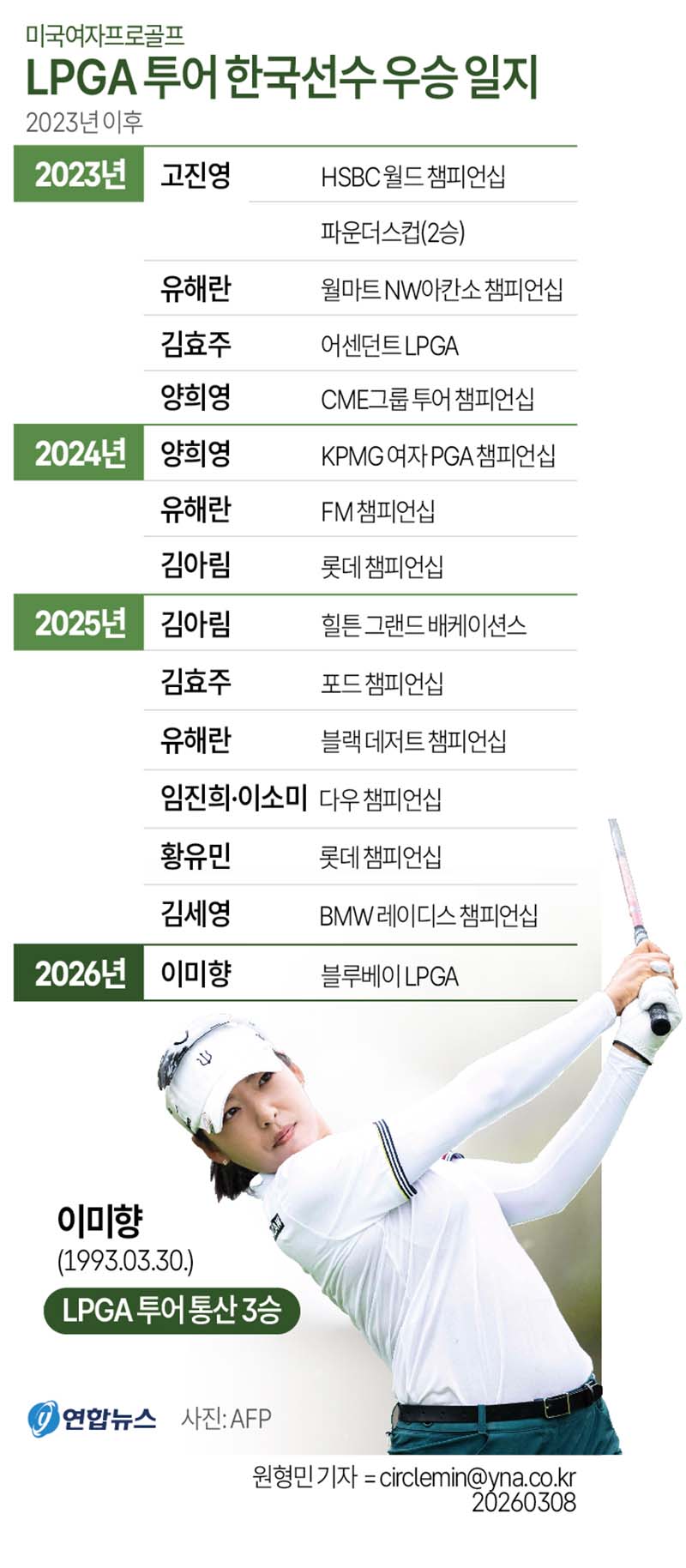 Life Style LPGA 투어 한국선수 우승 일지 By Haninpost Indonesia - March 9, 2026 이미향이 8년 8개월 만에 미국여자프로골프(LPGA) 투어 대회 우승을 차지했다. 이 기사가 정보에 도움이 되셨는지요? 기사는 독자 원고료로 만듭니다. 24시간 취재하는 10여 기자에게 원고료로 응원해 주세요. 한국 인도네시아 문의 카톡 아이디 haninpost *기사이용 저작권 계약 문의 : 카톡 아이디 haninpost