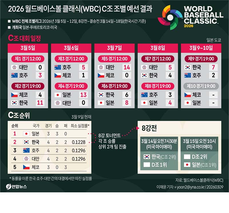 한국 야구가 9일 일본 도쿄돔에서 열린 2026 월드베이스볼클래식(WBC) 조별리그 C조 4차전 호주와 경기에서 7-2로 이겨 8강 결선 리그에 진출했다. 2승 2패를 기록한 한국은 대만, 호주와 동률을 이뤘으나 최소 실점률에서 앞서 일본(3승)에 이어 조 2위로 8강에 올랐다.