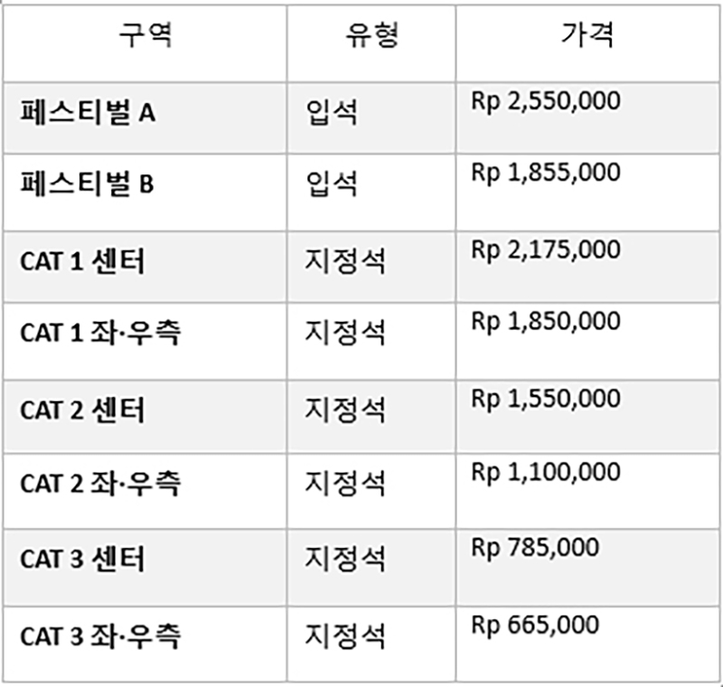 티켓 가격은 좌석 등급에 따라 Rp 665,000부터 Rp 2,550,000까지 다양하게 책정되어 있다. 주요 구역별 가격은 다음과 같다.