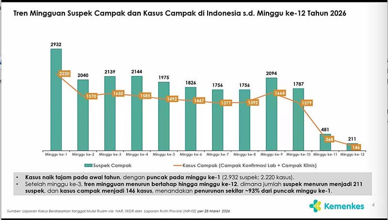인도네시아 보건부(Kementerian Kesehatan, 이하 Kemenkes)는 2026년 3월 말을 기준으로 전국 홍역 환자(Kasus Campak) 수가 연초 대비 약 93%에 달하는 큰 폭의 감소세를 기록하고 있다고 공식 발표했다. 보건부는 이번 감소세를 정부 주도의 감염병 억제 개입이 가시적인 성과를 거두고 있음을 보여주는 긍정적인 지표로 평가하면서도, 의료 현장에서의 방역 경계를 결코 늦춰서는 안 된다고 강력히 촉구했다.