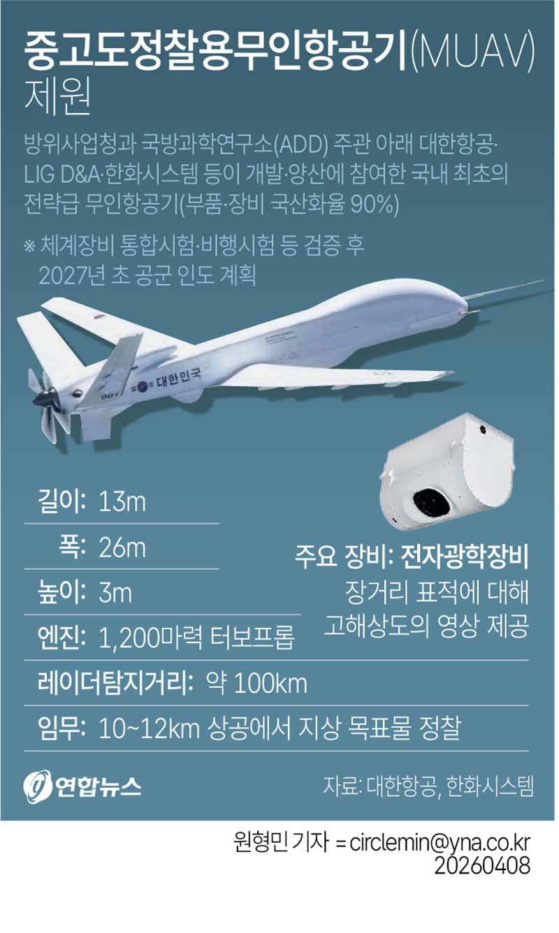 방위사업청은 8일 부산 대한항공 테크센터에서 중고도정찰용무인항공기(MUAV) 양산 1호기 출고식을 개최했다고 밝혔다. MUAV가 우리 군에 전력화되면 고성능 카메라와 센서를 통해 적의 전략 표적을 실시간으로 감시·대응할 수 있는 독자적 능력을 갖추게 된다고 방사청은 설명했다.