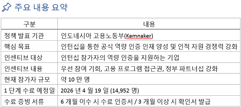 노동부(Kemnaker)가 국가 인턴십 프로그램(MagangHub)에 적극 참여하는 기업, 특히 인턴십 참가자의 역량 인증을 지원하는 기업을 대상으로 한 인센티브 제도를 마련 중이라고 밝혔다.