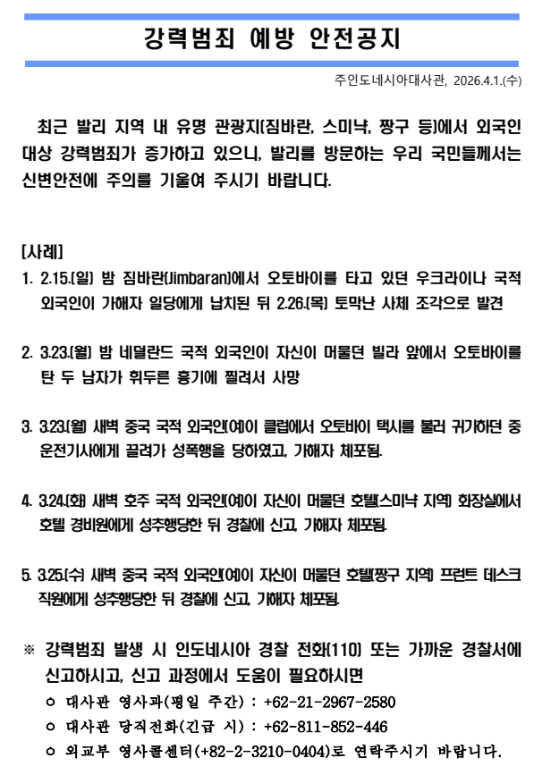 한국대사관 발리강력범죄 예방 안전공지.2026.0401