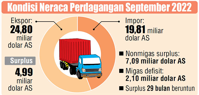 인도네시아의 9월 무역수지가 당초 예상치를 웃도는 49억9천만 달러(약 7조1천400억원)의 흑자를 기록했다.