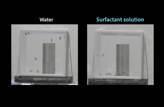 연구진은 물을 튀기는 성질을 갖고 있는 모기 몸의 표면에 계면활성제 용액을 뿌린 결과, 모기 몸이 물에 흠뻑 젖는 것을 발견했다.