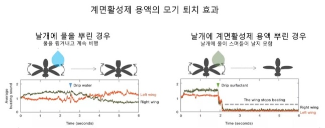 연구진은 “계면활성제를 넣어 물의 표면장력을 72mN/m에서 30mN/m으로 낮춘 용액을 30cm 거리에서 모기에게 분사했더니 벽에 붙어 있던 모기가 바닥에 떨어졌다”고 밝혔다. 바닥에 떨어진 모기 몸체에 남아 있는 계면활성제 분자의 양은 평균 112.5나노그램이었다. 순수한 물을 분사한 실험에서는 모기가 전혀 영향을 받지 않았다.