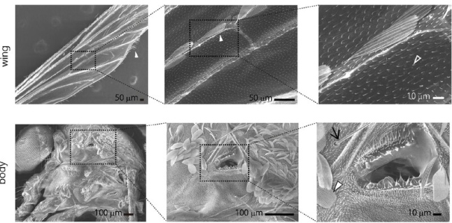 모기 날개의 미세 비늘 구조(위)와 몸체의 숨구멍(아래). 사이언티픽 리포트
